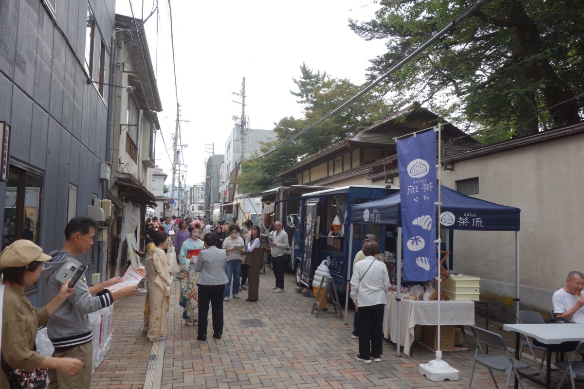 花小路が歩行者天国となり、キッチンカーが並び、イベントステージがつくられたり