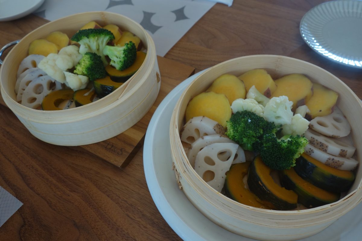 建て主さんご夫妻が裏の畑で育てている野菜を、せいろ蒸しで出してくださったり、