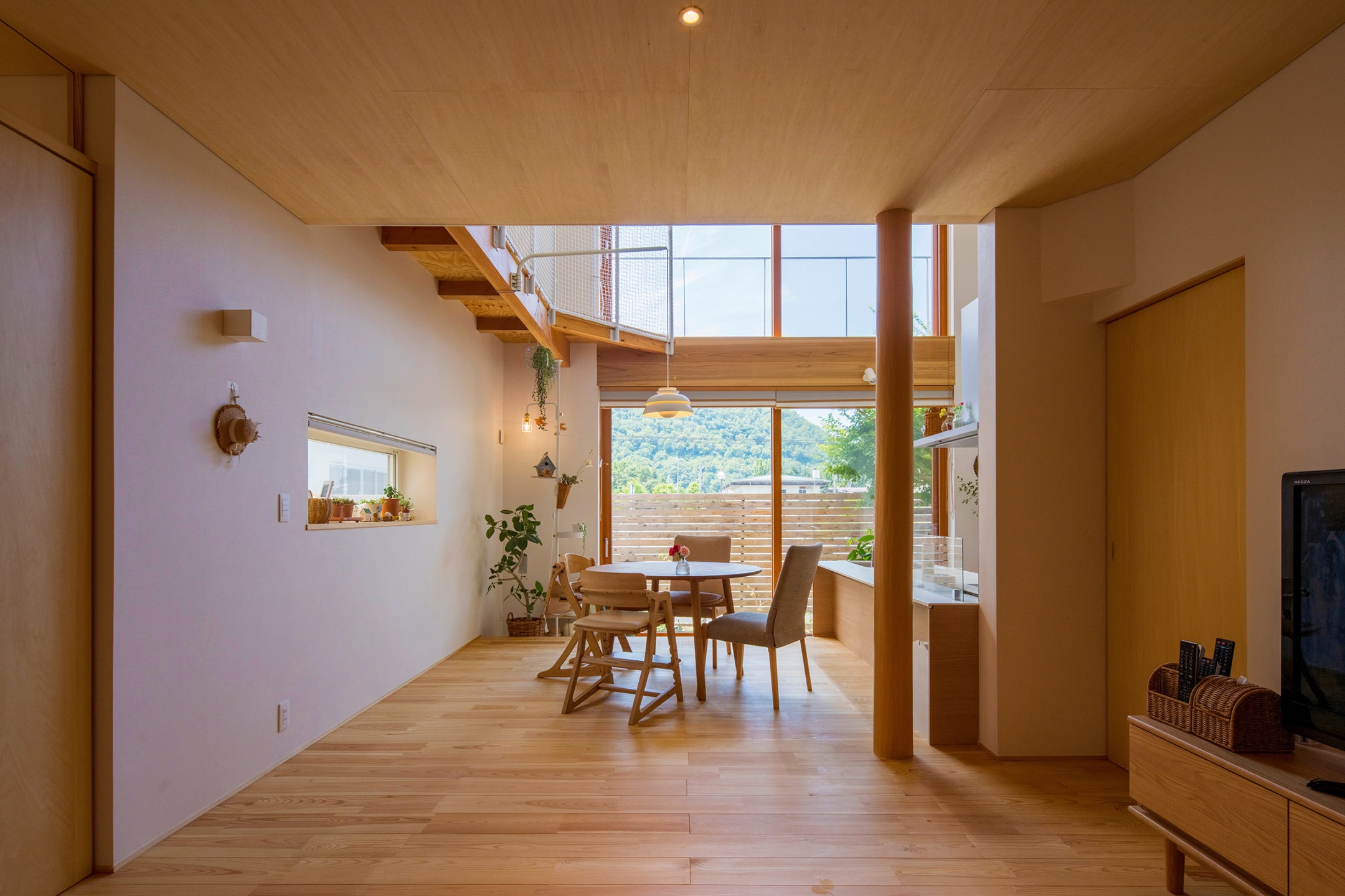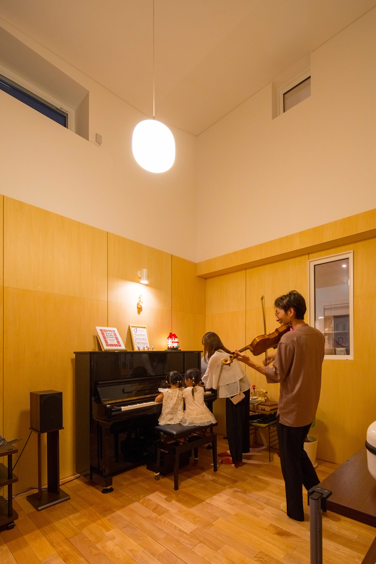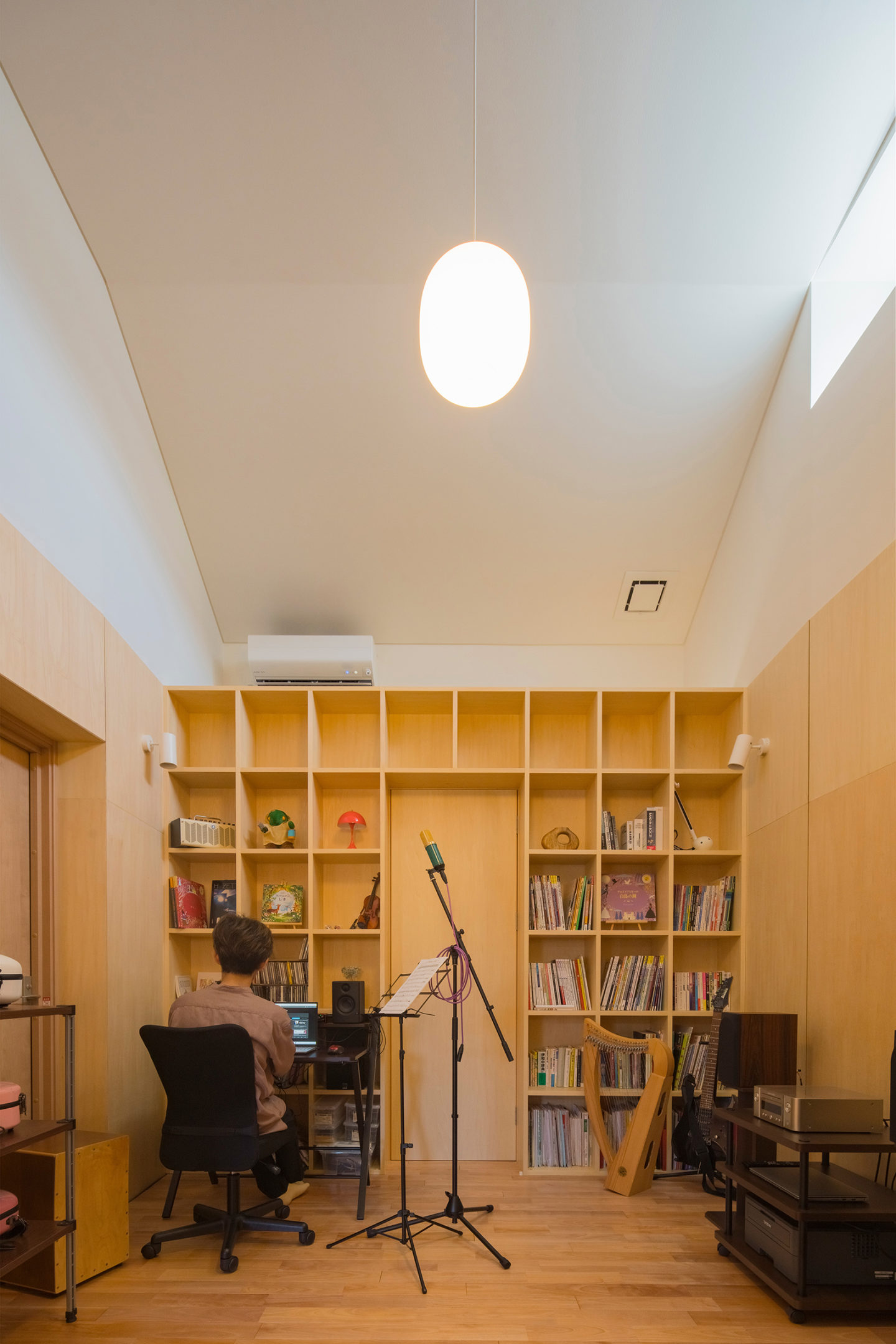 山形県庁にほど近い閑静な住宅街で、神奈備山である千歳山の景観を最大限に取り込んだ新築住宅。南北に長い敷地に大小の筒状の空間を並べて配置し、片方には防音性能を高めた音楽室とプレイルーム、書斎を設け、もう片方には主要な生活空間を設けました。両者は中央の土間玄関でつながり、鉄骨の回り階段で上下にも展開していきます。南に開かれた広間には二層吹き抜けの木製サッシによる大開口が設けられ、自然光が溢れるほどの明るい室内を実現するとともに、家族みんなで山に向かって楽しげな音を響かせるような、家全体が一つの大きな楽器のような住まいの形を考えました。