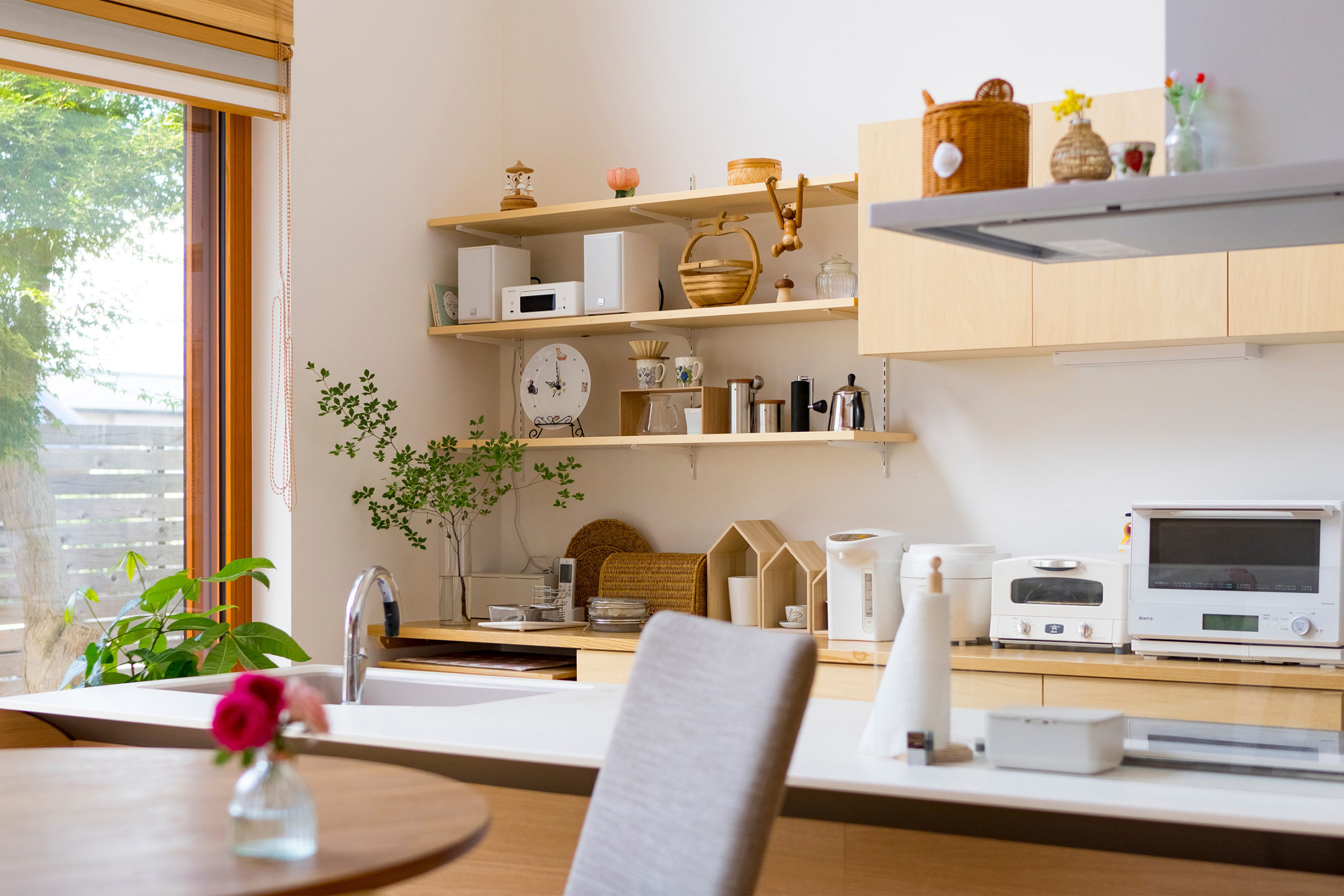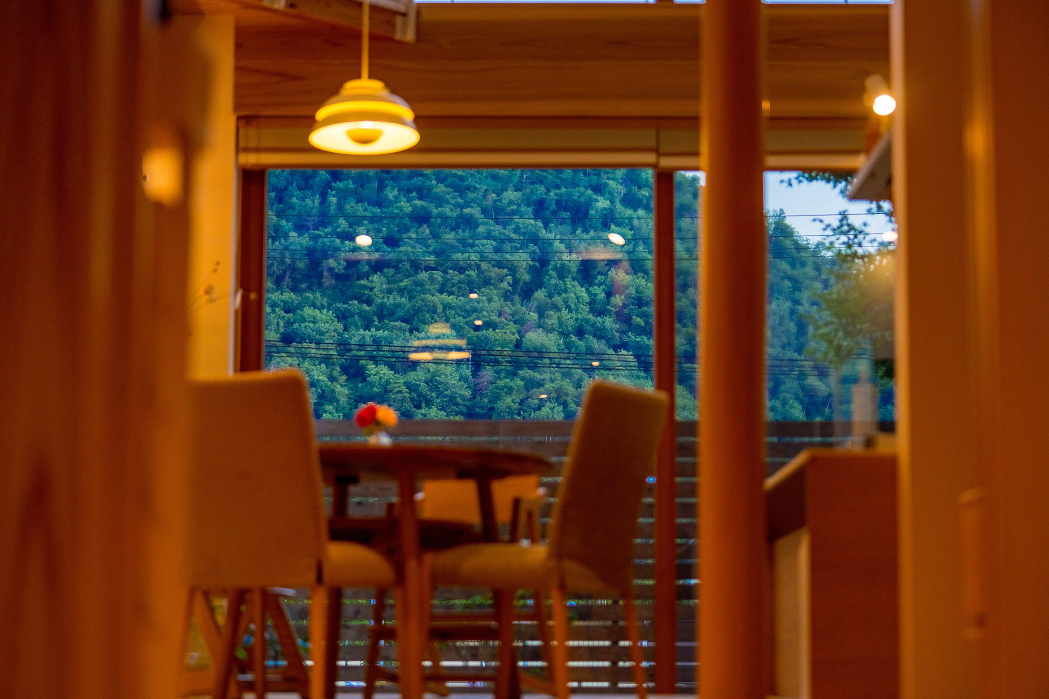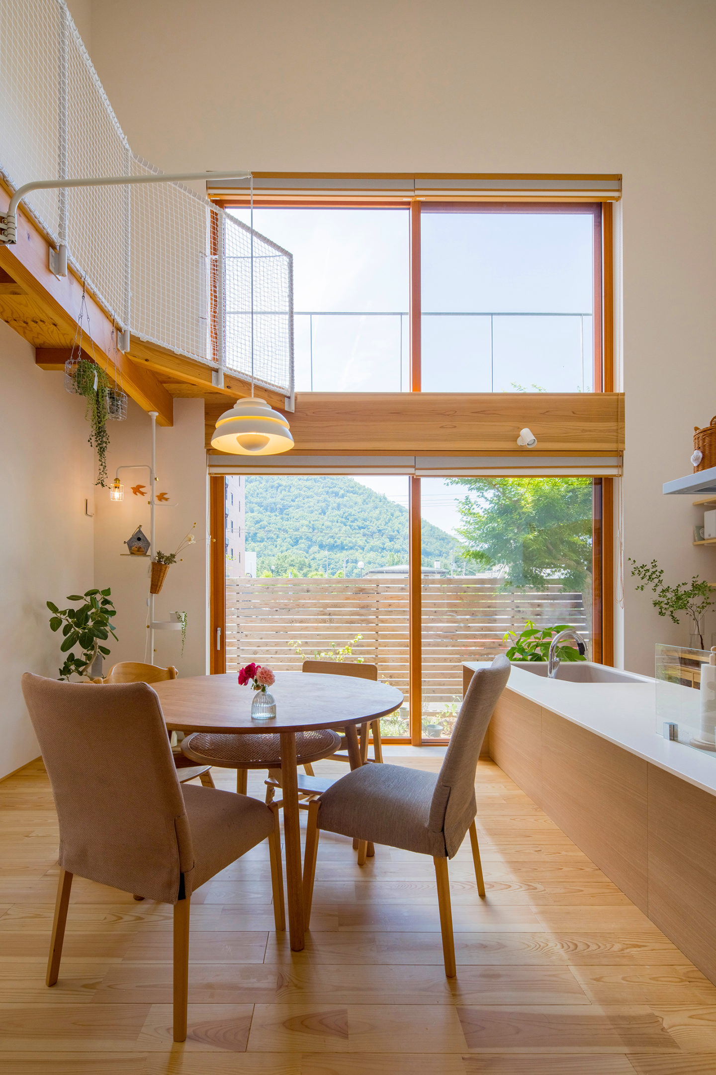 山形県庁にほど近い閑静な住宅街で、神奈備山である千歳山の景観を最大限に取り込んだ新築住宅。南北に長い敷地に大小の筒状の空間を並べて配置し、片方には防音性能を高めた音楽室とプレイルーム、書斎を設け、もう片方には主要な生活空間を設けました。両者は中央の土間玄関でつながり、鉄骨の回り階段で上下にも展開していきます。南に開かれた広間には二層吹き抜けの木製サッシによる大開口が設けられ、自然光が溢れるほどの明るい室内を実現するとともに、家族みんなで山に向かって楽しげな音を響かせるような、家全体が一つの大きな楽器のような住まいの形を考えました。